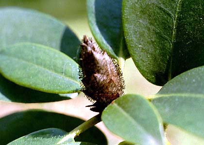 Die Häutungsreste bleiben als ein typisches Erkennungsmerkmal auf der Unterseite der Blätter zurück: Viele Kamelienfreunde sind sehr beunruhigt, wenn sie den Zikadenbefall bemerken (sprengen Sie jetzt im August einmal auf Ihre Kamelien oder Rhododendren! 20-30 Zikaden fliegen auf!). Meistens kommt dann die Frage nach Gift. Warum aber die erhebliche Beachtung, welche diese possierlichen Tiere hier erhalten? Nun, unsere Rhododendronfreunde müssen sehr beunruhigt sein: Es gibt nämlich eine Knospenfäule, die durch einen Pilz Pycnostysanus azaleae verursacht wird. Dieser kann offensichtlich sehr leicht in die Knospe eindringen, wenn die Zikade die Schuppen vorher anschlitzt, es gibt jedenfalls einen heftigen Pilzbefall nur, wenn auch die Zikade zugegen ist (Umgekehrt gibt es aber nicht unbedingt Knospenfäule, wenn Zikaden zugegen sind. Dies mag sich aber mit der Zeit ändern.) Es gibt inzwischen große, mannshohe Rhododendron, die so befallen sind, daß sie nur noch drei oder vier Blüten ausbilden. Sie müssen in der Regel vernichtet werden. Fast alle alten Rhododendronsorten sind gefährdet. Die gute Nachricht lautet aber, daß es resistente Sorten gibt. Der Kamelien.de - Tipp:Wenn Sie eine Neupflanzung planen, drängen Sie Ihren Lieferanten, nur resistente Sorten zu liefern. Wenn Sie genügend drängeln, wird man Ihnen Sorten nennen können ( Die Beobachtungszeit ist z. T. noch zu kurz, um eine abschließende Liste aufzustellen).![]() Braunschwarze Blütenknospen am Rhododendron. Bisher an Kamelien nicht beobachtet. ![]() Sporenträger des Pycnostysanus-Pilzes. |